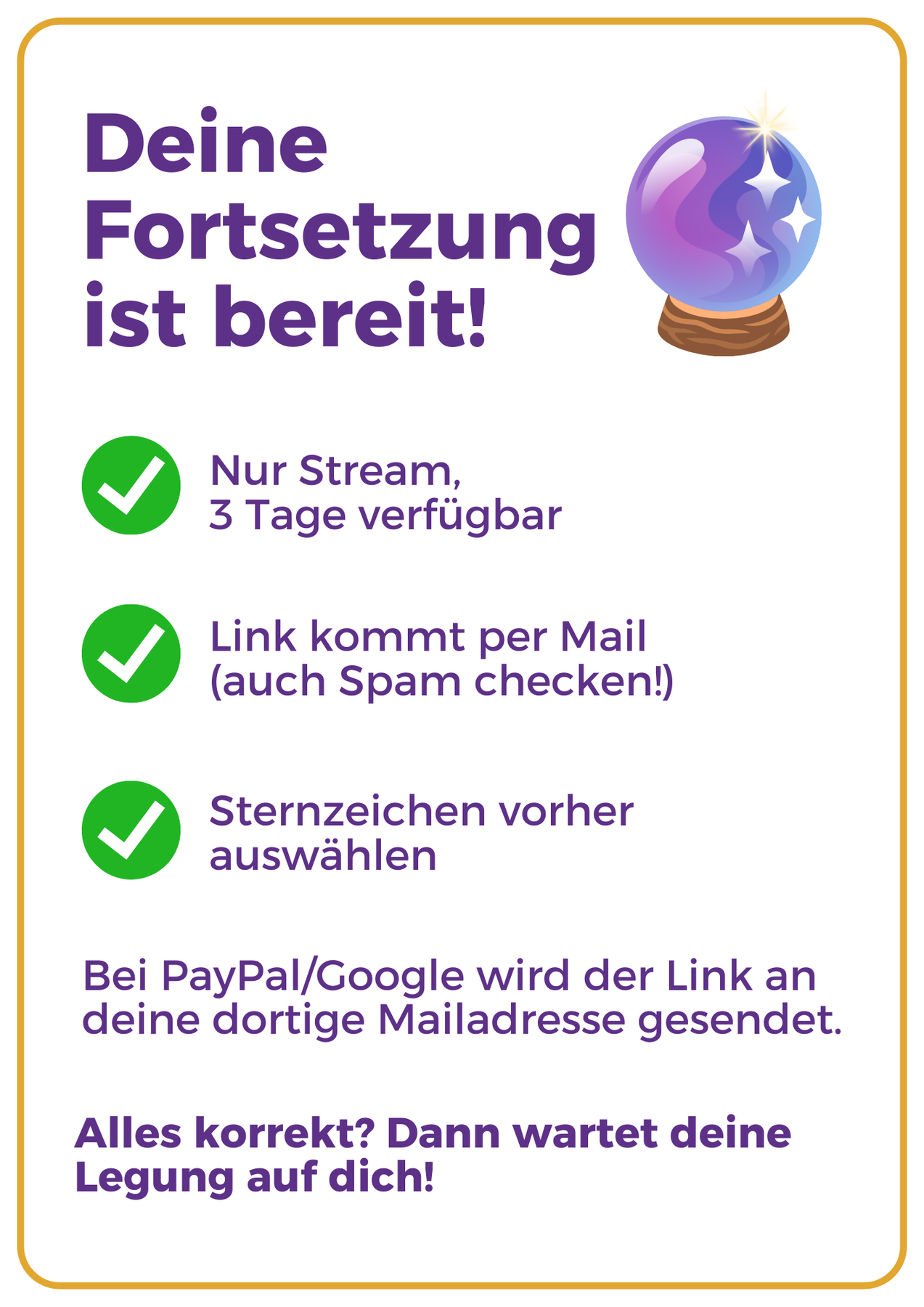 Fortsetzungen: Unmittelbar nach der Bezahlung wird dir der Zugangslink per Mail gesendet. Prüfe bitte auch deinen Spamordner. Bei Zahlungen mit Paypal wird der Link an die bei Paypal hinterlegte Mailadresse gesendet.